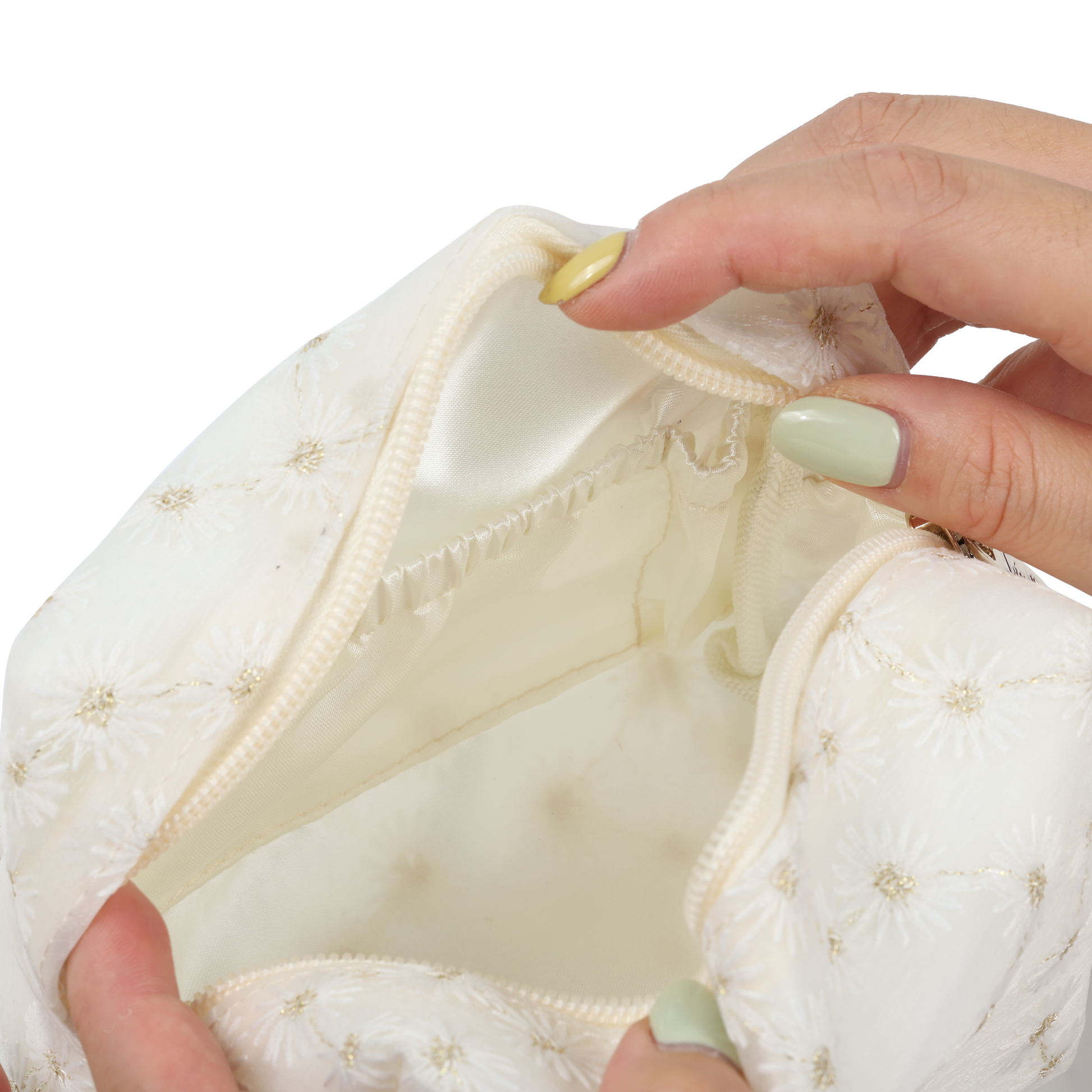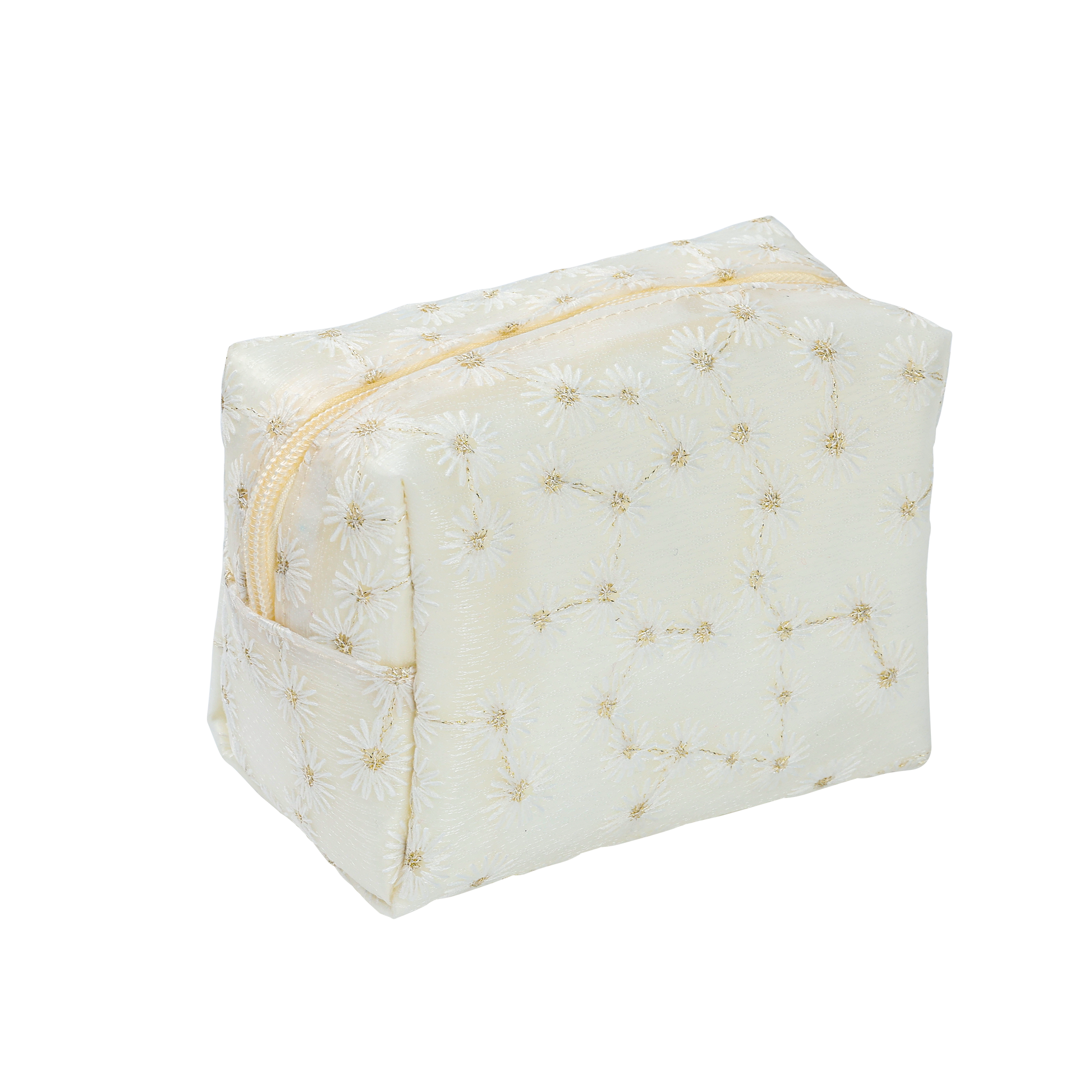 This Daisy Embroidered Toiletry Bag is designed with soft lavender flowers embroidered on pure white fabric, bringing a touch of elegance and romance. Perfect for daily use, travel, or as a thoughtful gift for friends.